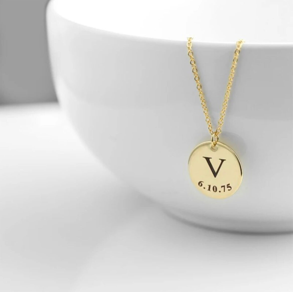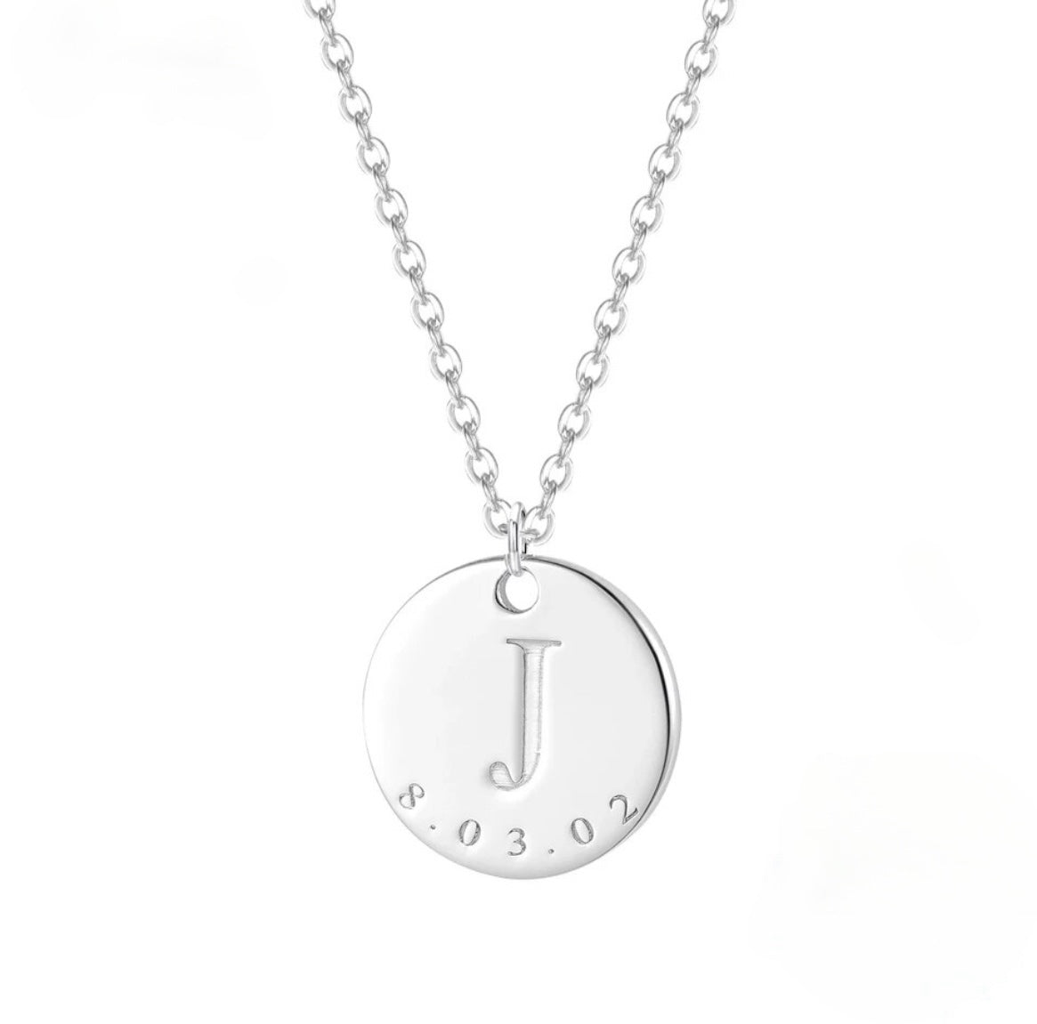 This personalised necklace features a round pendant available in three elegant colours: gold, sterling silver, and rose gold. Engraved with the initials and date of birth, it serves as a beautiful keepsake to cherish the memory of your child's birth or any significant date. The dainty chain adds a delicate touch to this meaningful accessory.