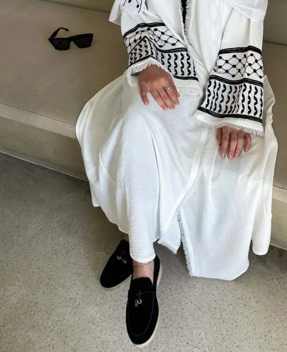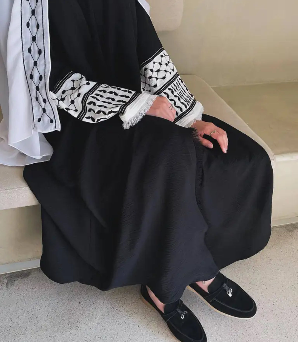 Introducing our elegant Palestinian Abaya, designed to make a statement of solidarity and style. This abaya features the iconic keffiyeh pattern on the arms, symbolizing Palestinian heritage and pride. Available in classic white and black, it comes in all sizes to ensure a perfect fit for everyone.