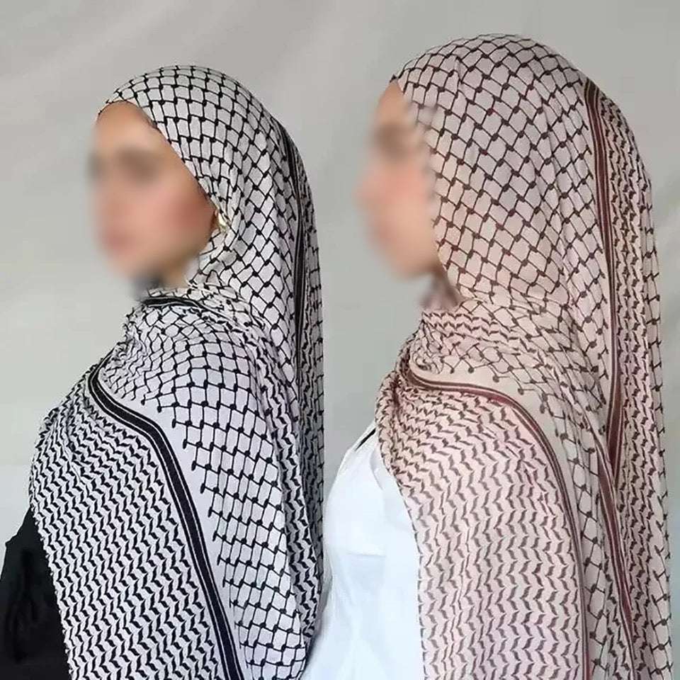 Stay stylish and support the cause with our chiffon Palestine Keffiyeh Hijab. This long hijab features the iconic Palestine keffiyeh print and comes in two elegant colors. Perfectly paired with our Palestine Keffiyeh Abaya, it's a must-have for any fashionable and socially conscious woman.